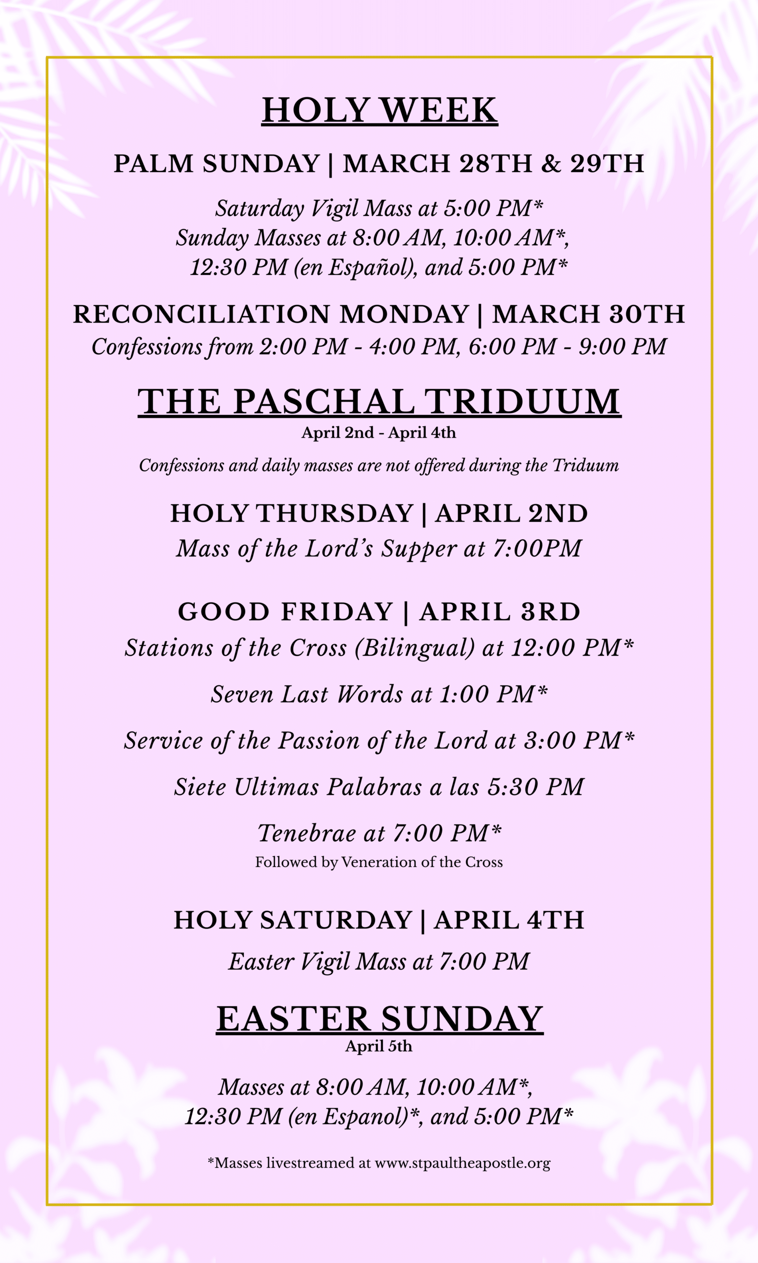 Find our full Holy Week mass and events schedule below! We begin with our first Palm Sunday liturgies – a vigil mass on Saturday, March 28th at 5PM – and end with Easter Sunday celebrations on Sunday, April 5th. Join us in-person or by livestream! We recommend you arrive at all Holy Week services 15 minutes before their start time; they are our busiest services of the year, so get here early to make sure you’ve got a seat. God bless, and we look forward to praying with you.